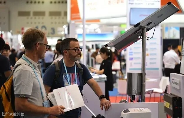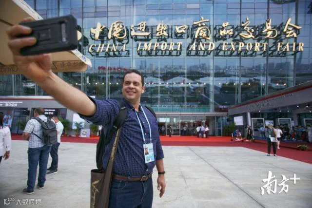 资料图:境外采购商在广交会场内打卡留念。