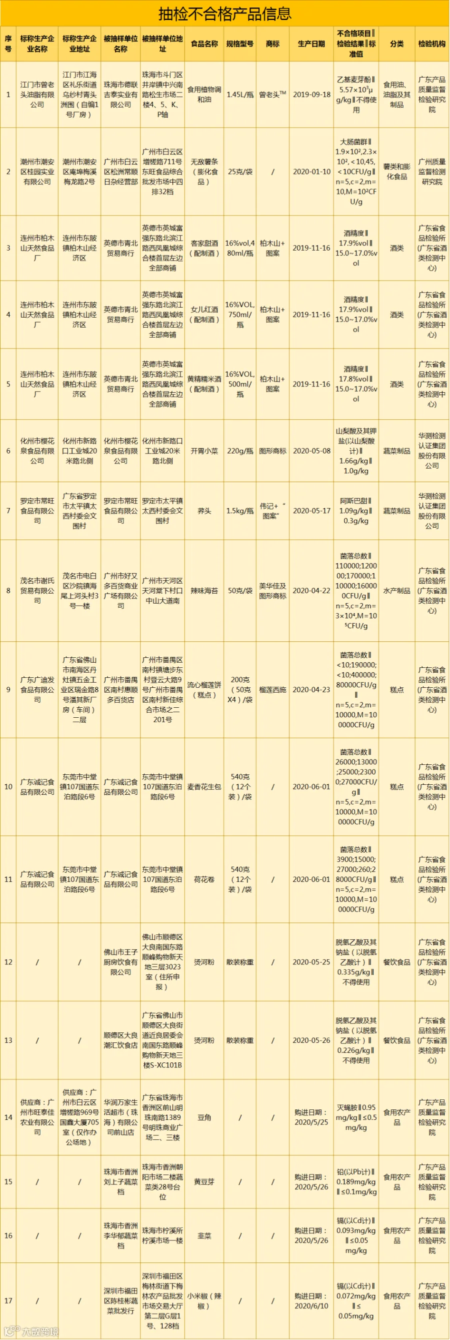 本次公布信息中所涉的不合格食品