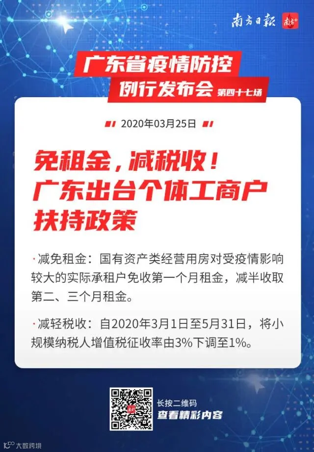 为有序推动个体工商户加快复工复产复市,3月25日下午,在广东省政府新闻办召开的发布会上,省市场监督管理局局长麦教猛表示,针对疫情发生以来个体工商户生产经营面临的系列困难与问题,省市场监管局牵头会同省发展改革委、财政厅、人力资源和社会保障厅、商务厅、国资委,广东省税务局、人民银行广州分行、广东银保监局等9部门,坚持问题导向,聚焦重点难点,按照积极稳妥、短期救助和长期互助相结合的思路,研究制定了《关于应对疫情影响加大对个体工商户支持力度的若干政策措施》(以下简称《措施》),从降低经营成本、加大资金纾困力度、包容审慎监管、加强服务保障四个方面提出了23条措施。