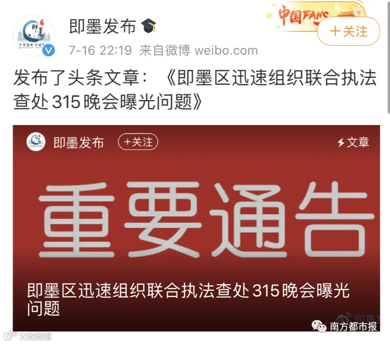 3·15晚会上,山东青岛即墨区部分“养海参整箱放敌敌畏,南方海参冒充北方海参”被点名。昨晚劲22时16分,该区新闻中心官方微博“即墨发布”发布通告,称即墨区委区政府高度重视此事,已立即责成即墨区农业农村局、市场监管局、自然资源局、公安分局联合开展执法检查,对相关问题迅速调查、依法处理。