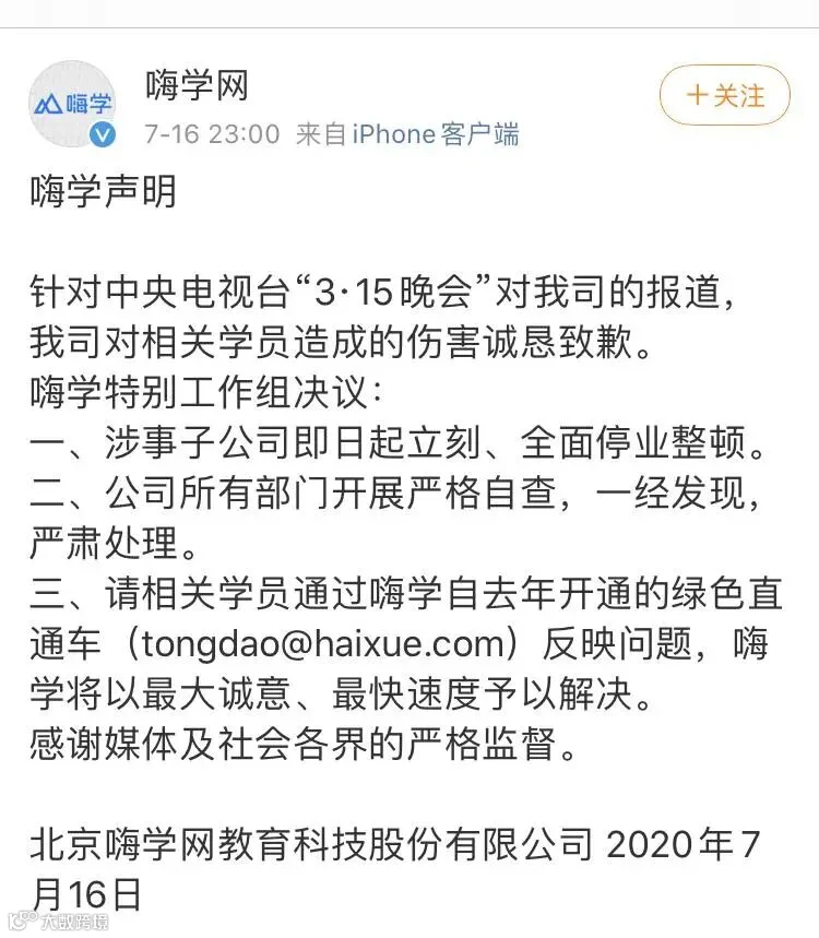 昨天(16日)23时,“嗨学网”官方微博发布声明称,该司对相关学员造成的伤害诚恳致歉。嗨学特别工作组决议:涉事子公司即日起立刻、全面停业整顿;公司所有部门开展严格自查,一经发现,严肃处理;请相关学员通过嗨学自去年开通的绿色直通车反映问题。