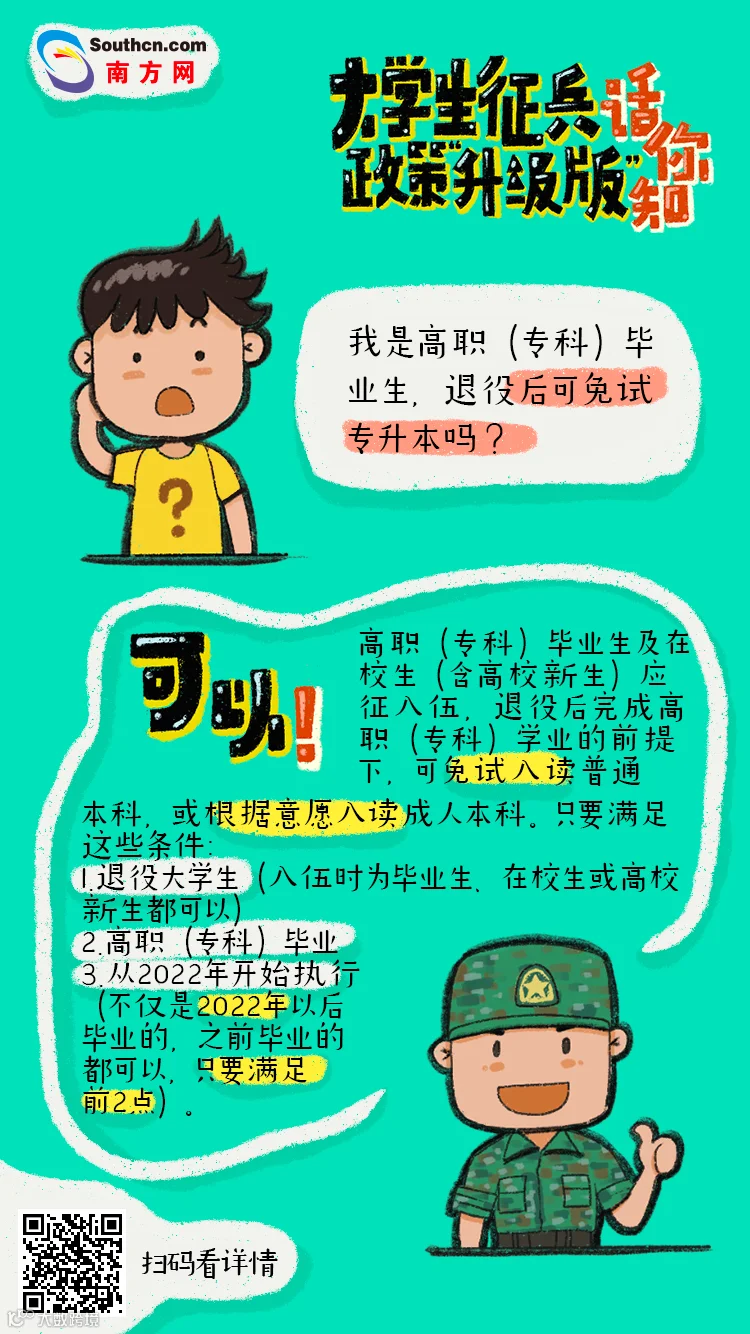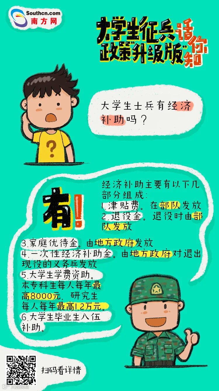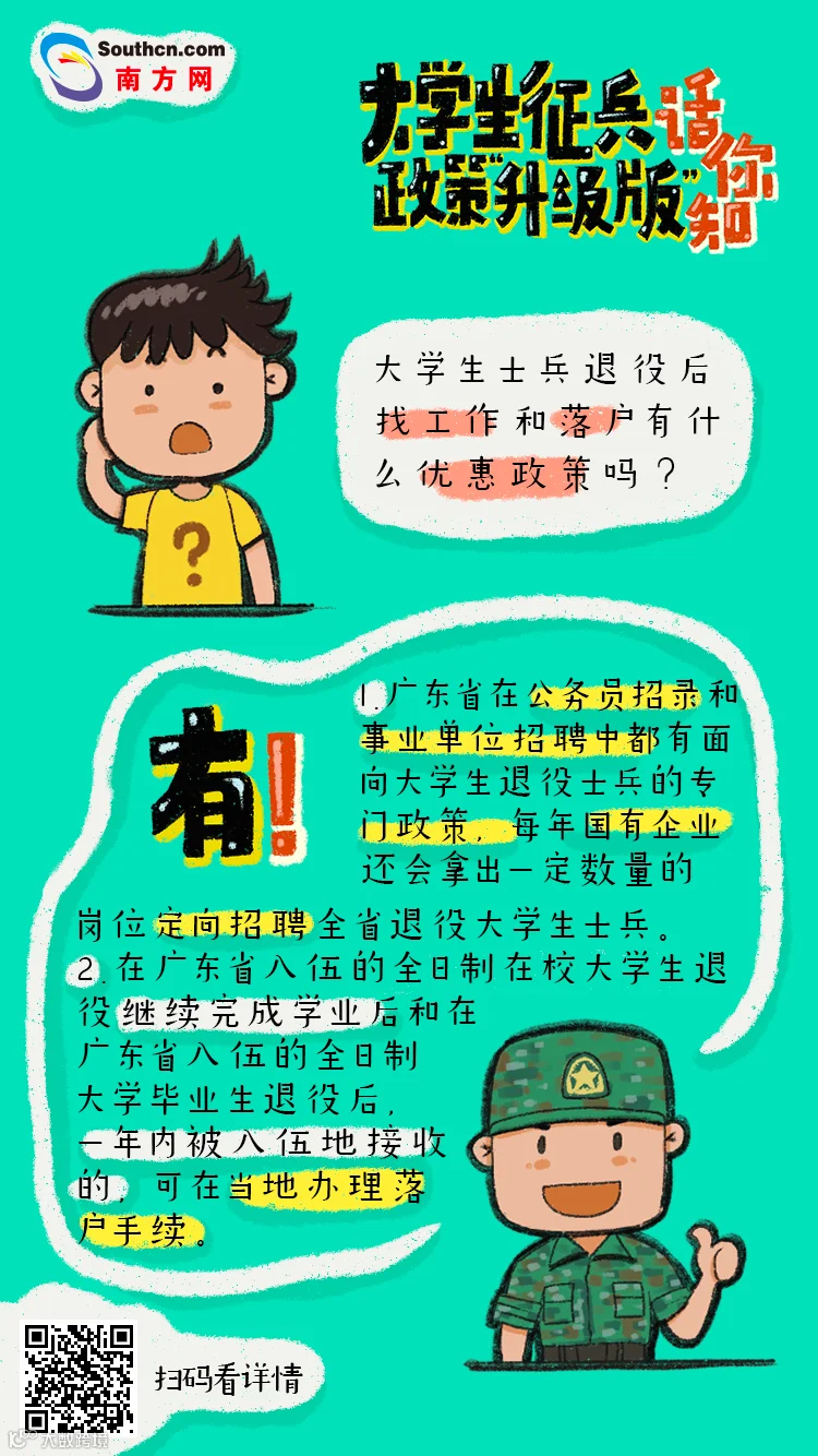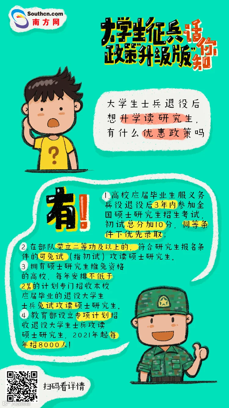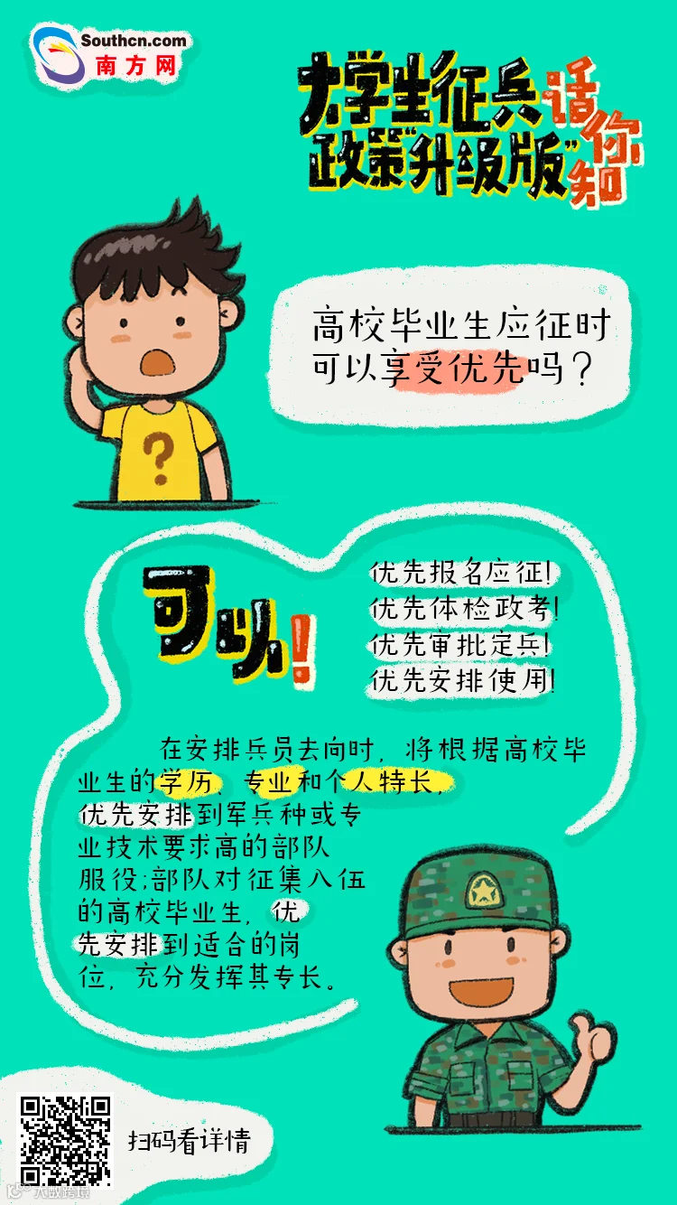 今年,为进一步优化大学生征集结构,提高应届大学毕业生征集比例,为部队输送更多高素质兵员,教育部、中央军委国防动员部联合下发通知,为大学生征兵政策“升级”!快和南方君一起来看看都有哪些亮点吧!