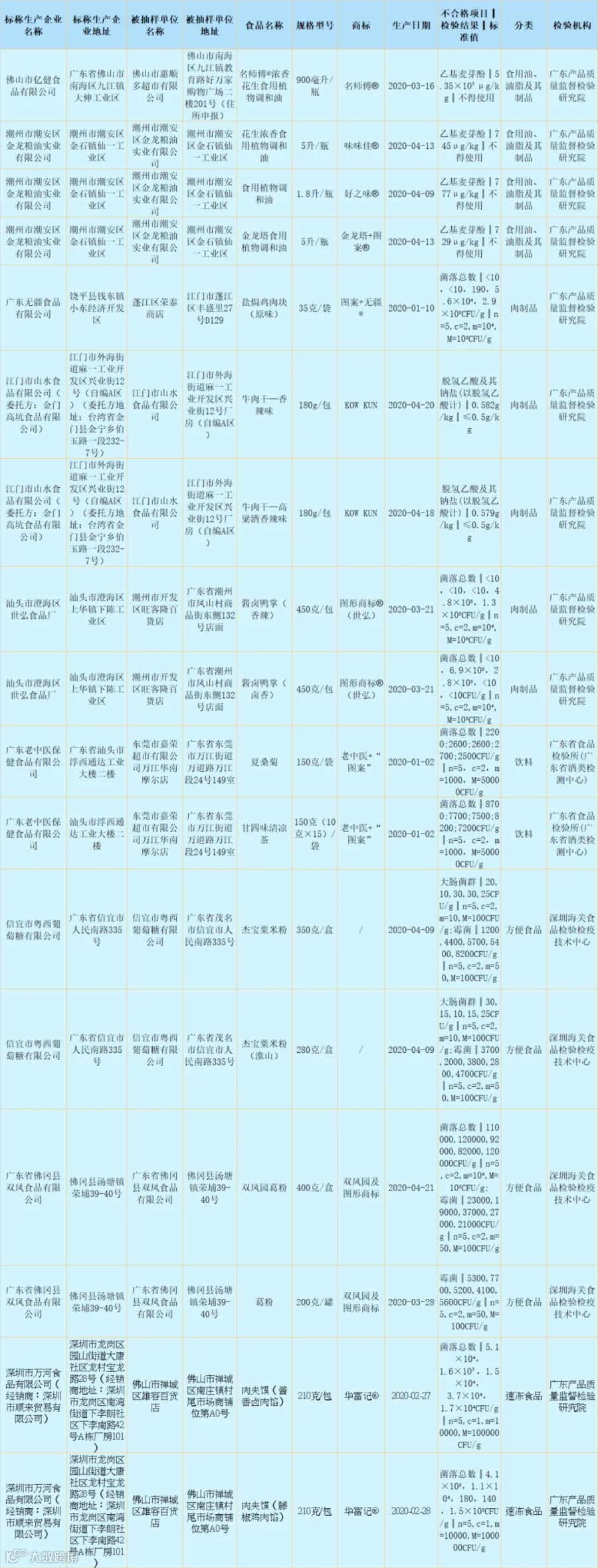 根据2020年国家和广东省食品安全监督抽检计划,广东省市场监督管理局组织抽检粮食加工品、调味品、肉制品、饮料、方便食品、速冻食品、茶叶及相关制品、蔬菜制品、食糖、淀粉及淀粉制品和食用油、油脂及其制品等11类食品928批次样品。根据食品安全国家标准检验和判定,其中抽样检验项目合格样品911批次、不合格样品17批次,检出微生物污染及食品添加剂超范围超限量使用问题。