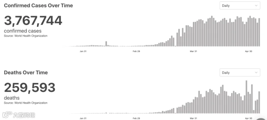 根据世卫组织最新实时统计数据显示,全球确诊新冠肺炎3767744例,死亡259593例。