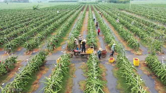 在桥红农业火龙果基地,农民正在采摘火龙果。