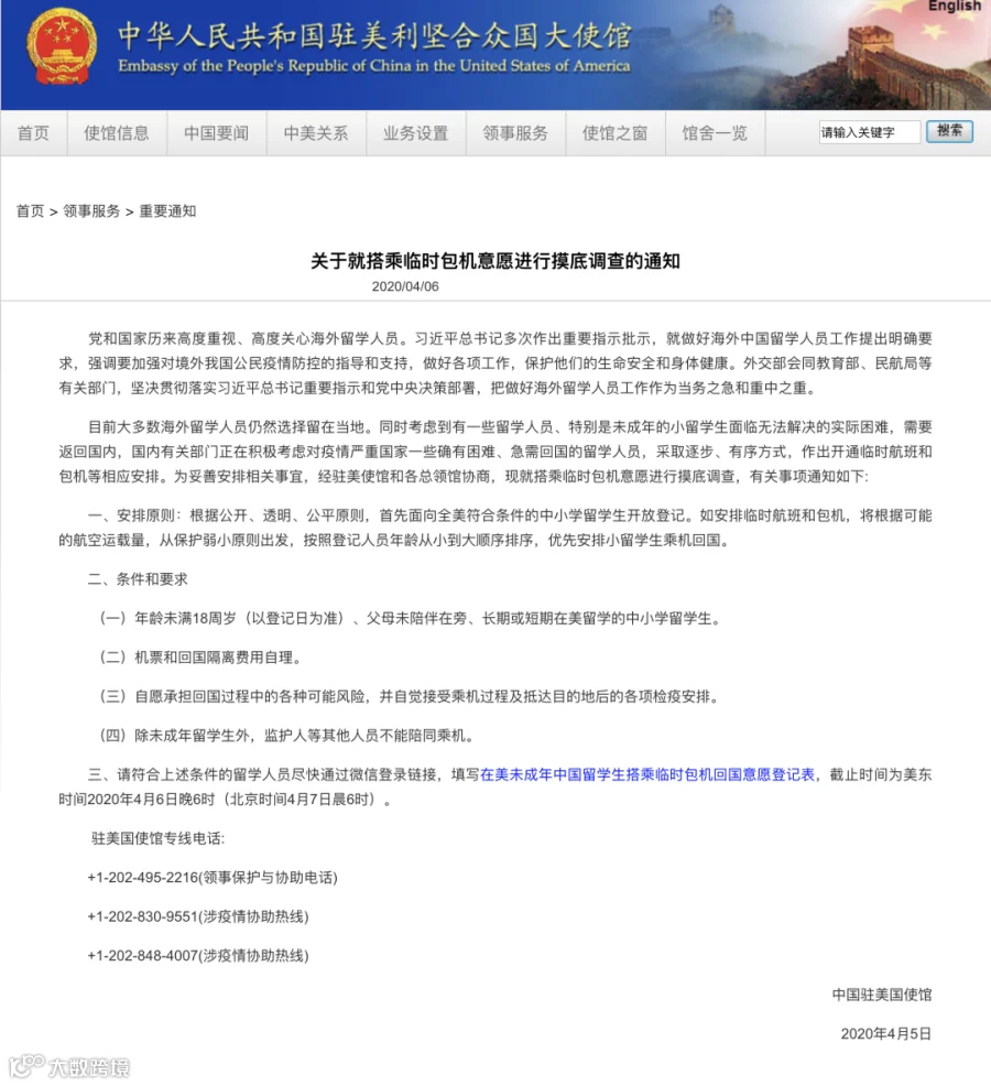 6日,中国驻美大使馆发布关于就搭乘临时包机意愿进行摸底调查的通知。