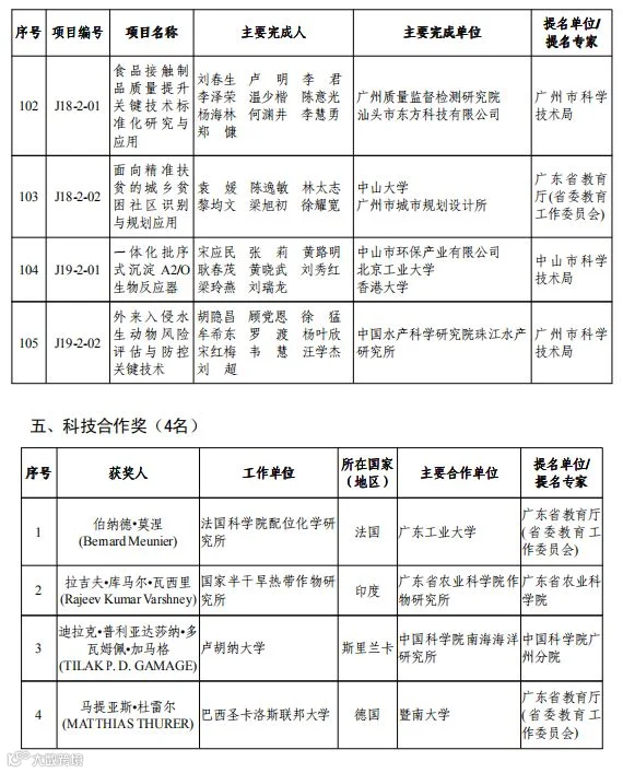 此外,授予伯纳德·莫涅、拉吉夫·库马尔·瓦西里、迪拉克·普利亚达莎纳·多瓦姆佩·加马格、马提亚斯·杜雷尔4名专家科技合作奖。