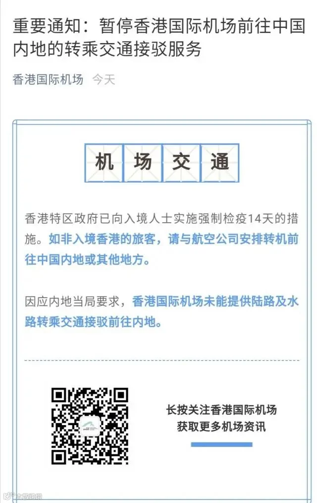 防控升级!香港国际机场:暂停前往内地的转乘交通接驳服务