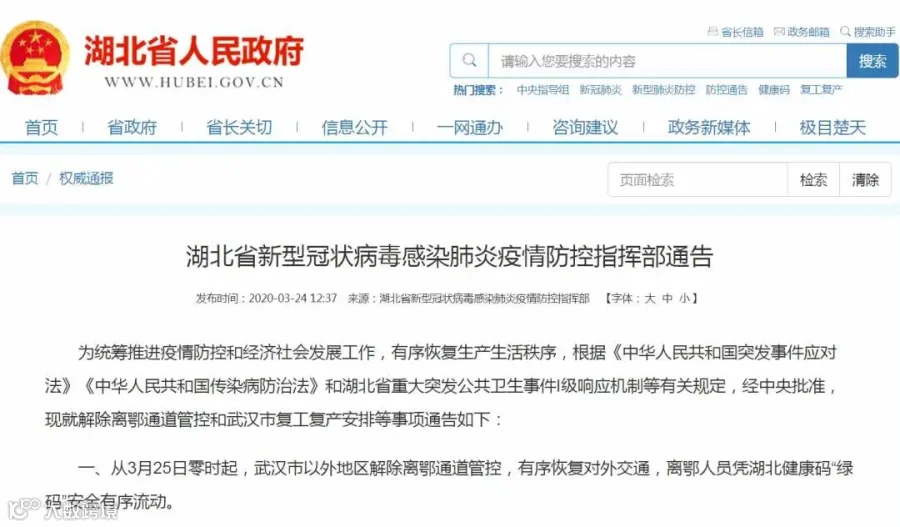 3月24日,湖北省新型冠状病毒感染肺炎疫情防控指挥部发布通告,从3月25日零时起,在做好健康管理、落实防控措施的前提下,对持有湖北健康码“绿码”的外出务工人员,经核酸检测合格后,采取“点对点、一站式”的办法集中精准输送,确保安全有序返岗。从4月8日零时起,武汉市解除离汉离鄂通道管控措施,有序恢复对外交通,离汉人员凭湖北健康码“绿码”安全有序流动。