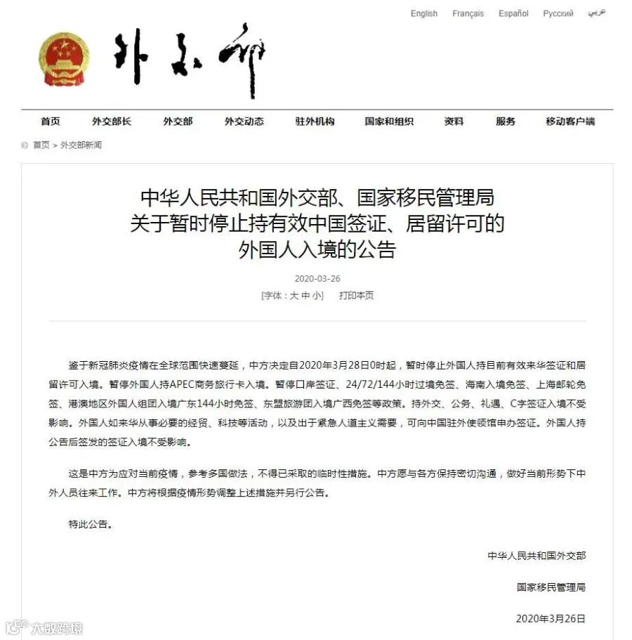 刚刚(3月26日),外交部官网发布《中华人民共和国外交部、国家移民管理局关于暂时停止持有效中国签证、居留许可的外国人入境的公告》。