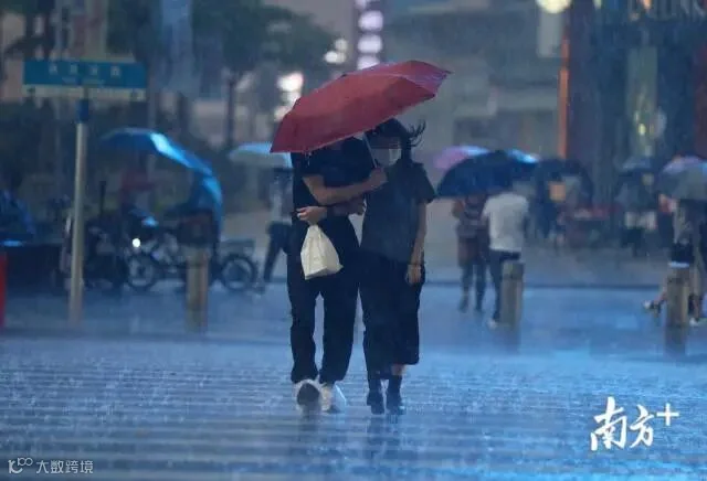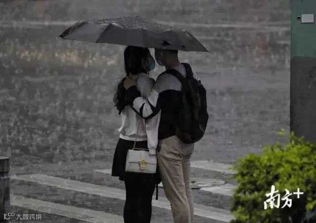 下午5点20分,天河体育东路,天空下起瓢泼大雨,市民们撑伞过马路。