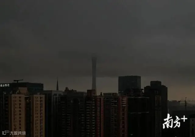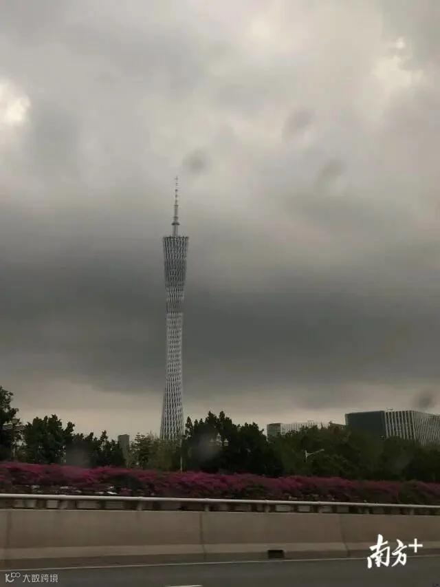 27日下班时间,广州降下大雨,小蛮腰被乌云“削掉”了塔顶。