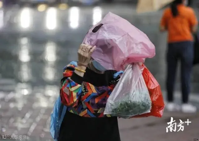 江南大道江南西路口,一位市民用塑料袋遮挡突降的暴雨。