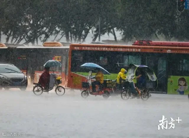 下午5点20分,天河体育东路,天空下起瓢泼大雨,外卖小哥在雨中前行。