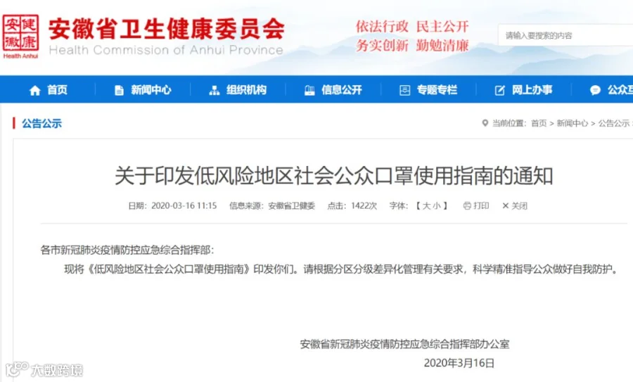 昨天(3月16日),安徽卫健委官网发布“关于印发低风险地区社会公众口罩使用指南的通知”。