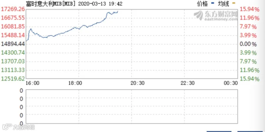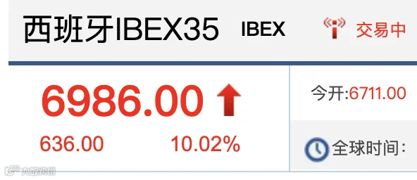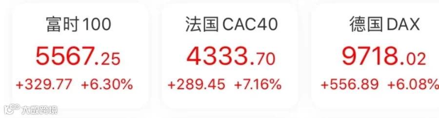 英国富时100指数、法国CAC40指数、德国法兰克福DAX指数均上涨超6%!意大利MIB指数超过14%,富时A50期货指数出现快速反弹。