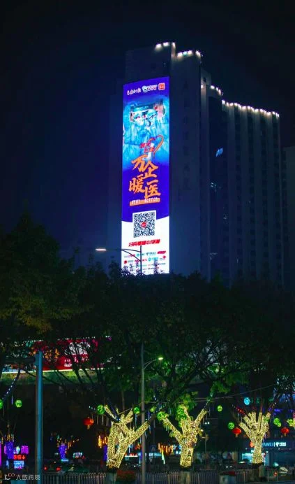 广州天河路外经贸大厦上,“万企暖医——我们在行动”主题海报点亮。