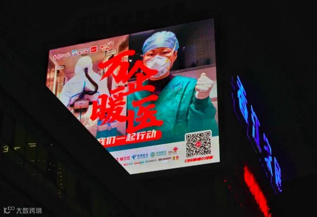正式启动,活动主题公益海报当晚在广州天河路、广州大道中、广州大道北等多座地标建筑外墙的LED屏幕上亮相,旨在联合社会各界通过公益海报的形式为抗疫一线的医护人员加油打气。