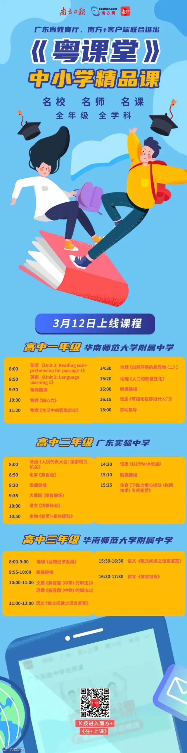 3月12日,南方+云学校将继续上新92节课程!覆盖小学一年级到高中三年级,让学生在家也能约见名师。