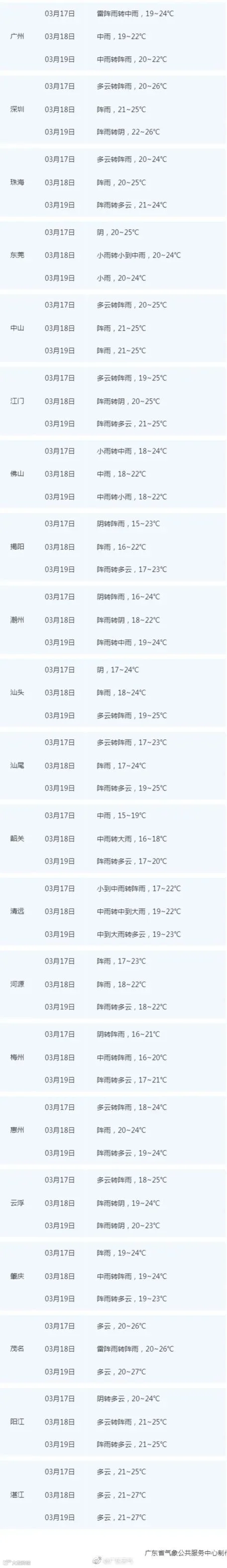 18-19日:粤北和珠江三角洲大部市县有中到大雨,其中韶关、清远有大雨到暴雨,雷雨时局地伴有8级左右短时大风,湛江多云局部有小雨,其余市县有(雷)阵雨局部大雨。