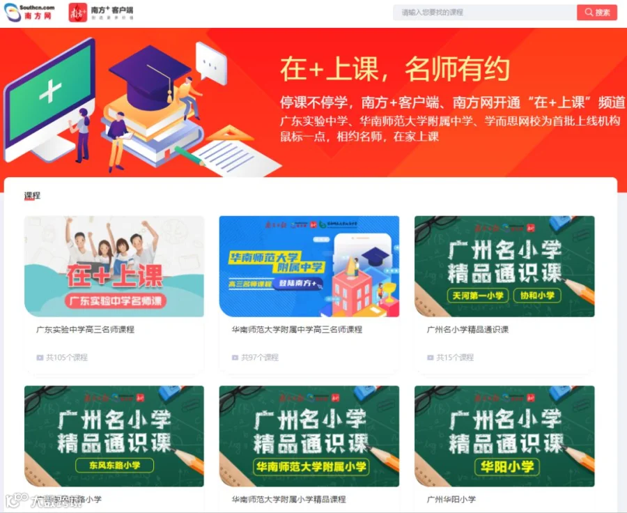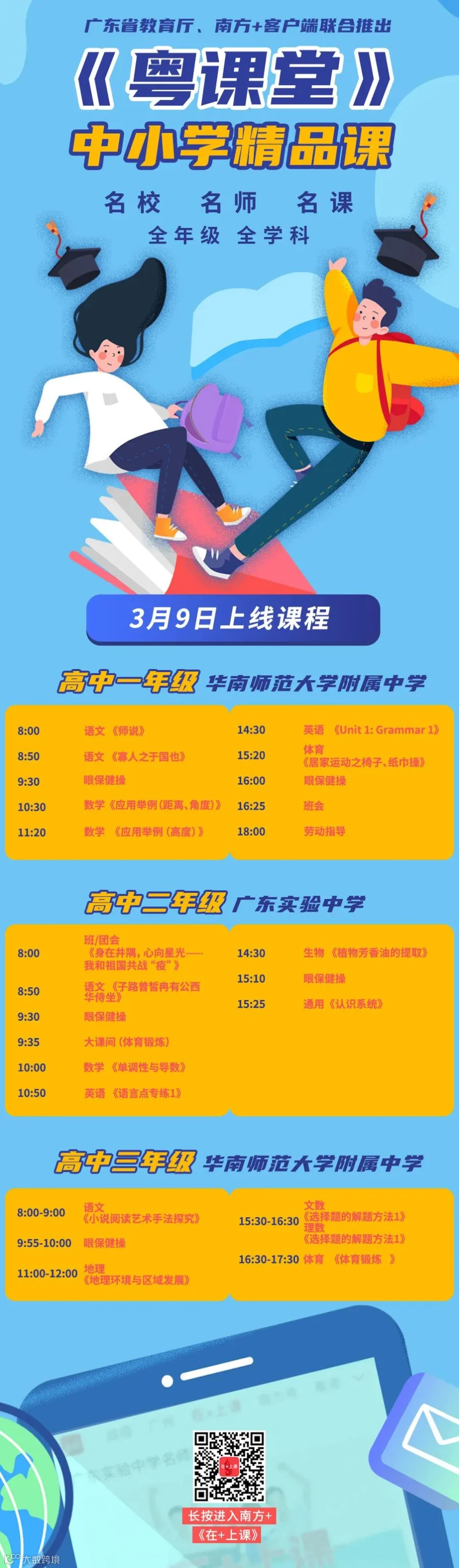 3月2日起,广东中小学校开展线上教育,保证新学期教育教学进度。省教育厅与南方报业传媒集团合作打造南方+云学校,把南方+客户端作为《粤课堂》系列精品课的主要网络收看渠道,开通《在+上课》频道,每天提供名师精品课程,向全省学生免费开放共享。