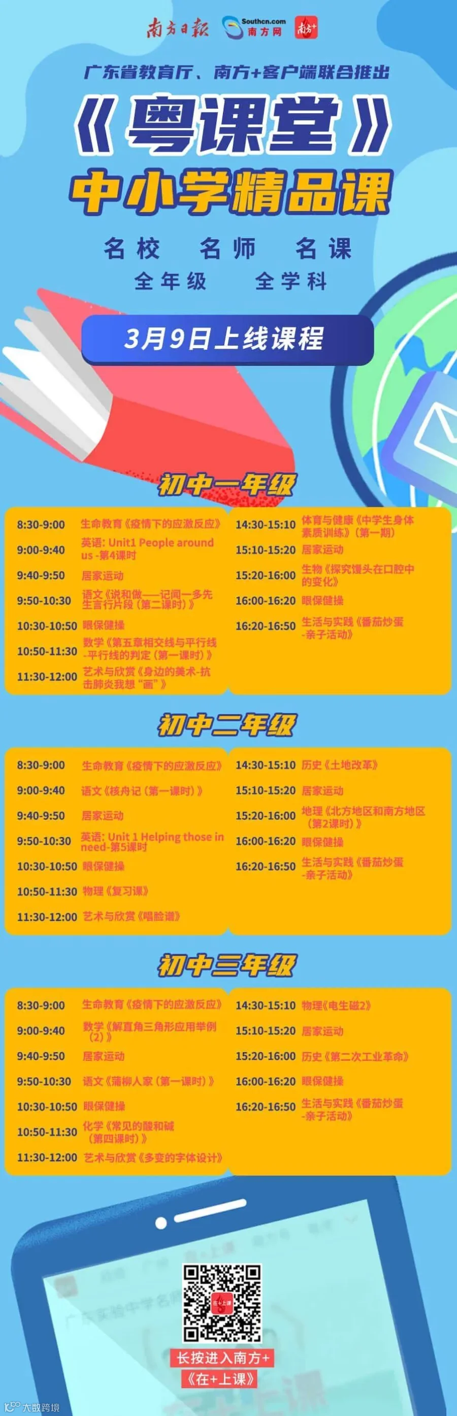 南方网3月9日,南方+云学校将继续上新94节课程!覆盖小学一年级到高中三年级,让学生在家也能约见名师。