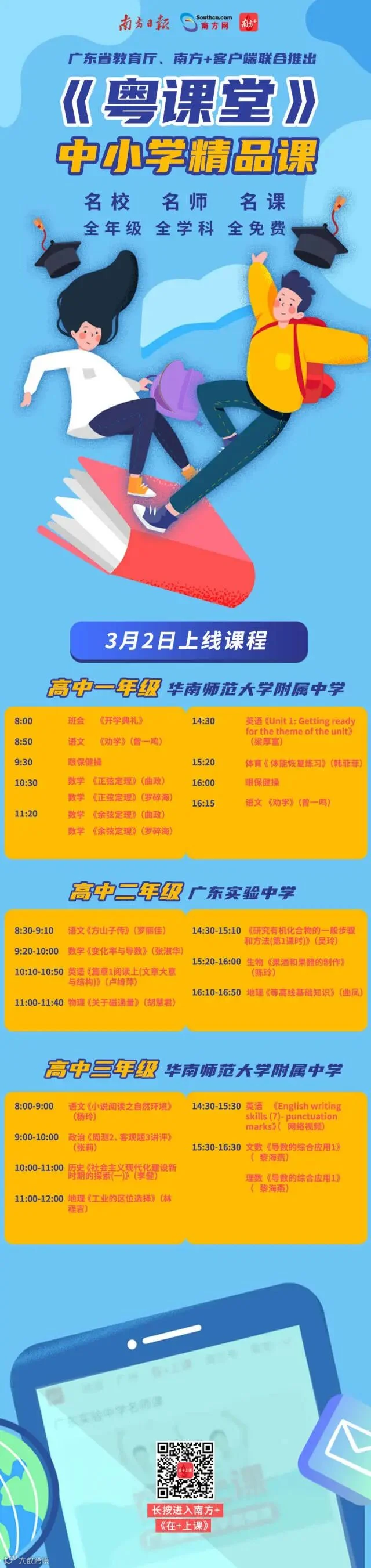 3月2日起,除继续上线省实、华附高三名师精品课外,“在+上课”频道还将与省教育厅合作推出“粤课堂”精品课,更包括了省实高二、华附高一名师精品课程,实现全学科全覆盖,满足更多高中学生的学习需求。