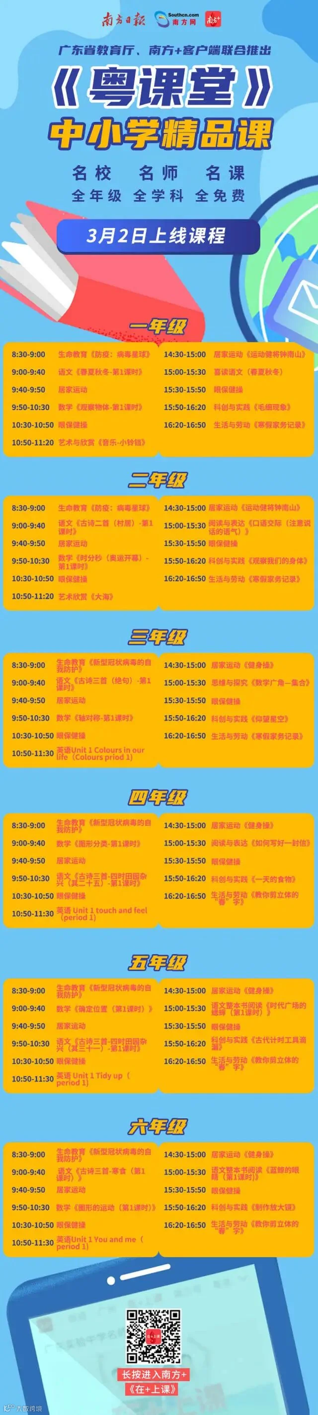 比如,广州市天河区华阳小学每天都会上新生命守护课程,致敬守护生命的抗疫者;华南师范大学附属小学上新美术、音乐等课程,促进全面发展;宝玉直实验小学上线心理课,关注孩子的心理健康教育,帮助孩子在家安心战“疫”,静心战“疫”。