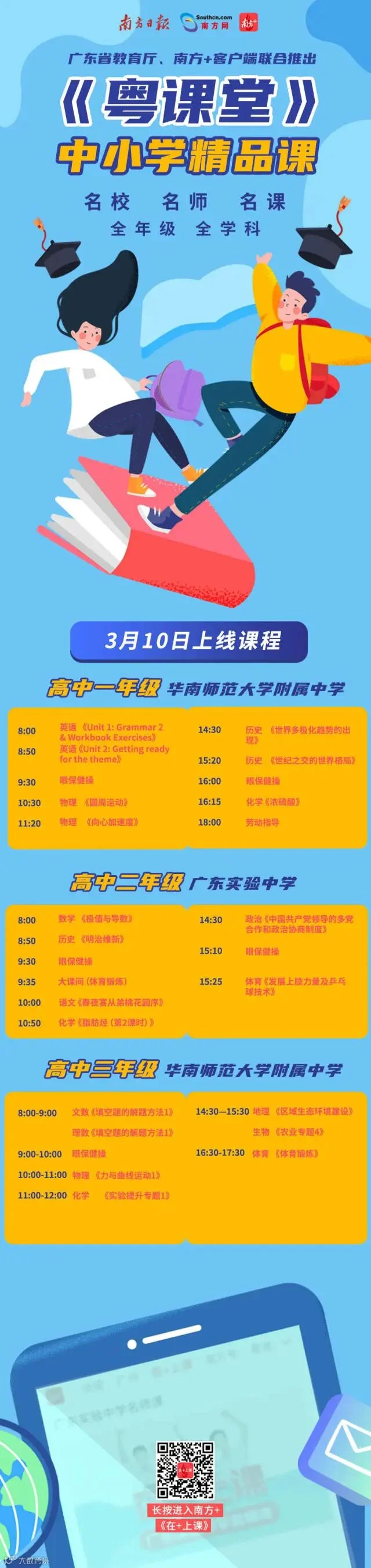 3月10日,南方+云学校将继续上新94节课程!覆盖小学一年级到高中三年级,让学生在家也能约见名师。