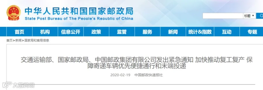 2月19日晚间,交通运输部、国家邮政局、中国邮政集团有限公司发出紧急通知,要求加快推动邮政快递企业复工复产。