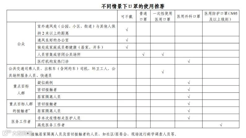 具体见附表:不同情景下口罩的使用推荐。