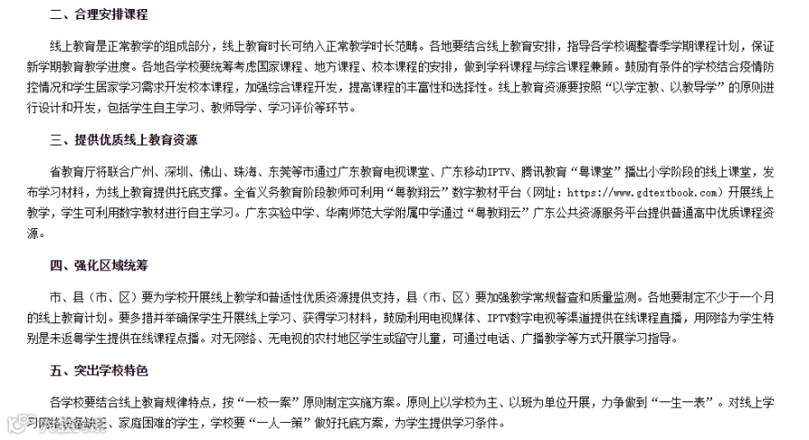 广东省教育厅发布的《广东省中小学校线上教育工作指引》(以下简称《指引》)明确:线上教育是正常教学的组成部分,线上教育时长可纳入正常教学时长范畴。各地要结合线上教育安排,指导各学校调整春季学期课程计划,保证新学期教育教学进度。
