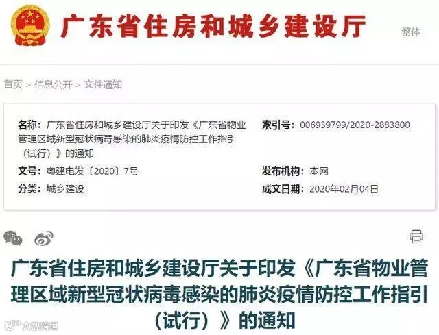 2月4日,广东省住建厅印发《广东省物业管理区域新型冠状病毒感染的肺炎疫情防控工作指引(试行)》,要求物业服务企业管理的项目按此指引执行疫情防控工作。