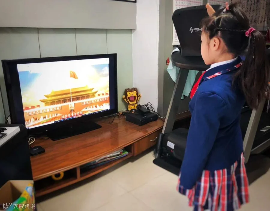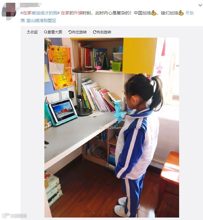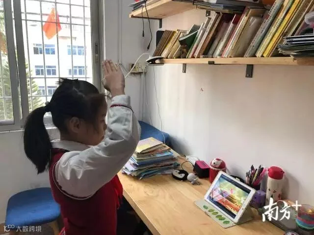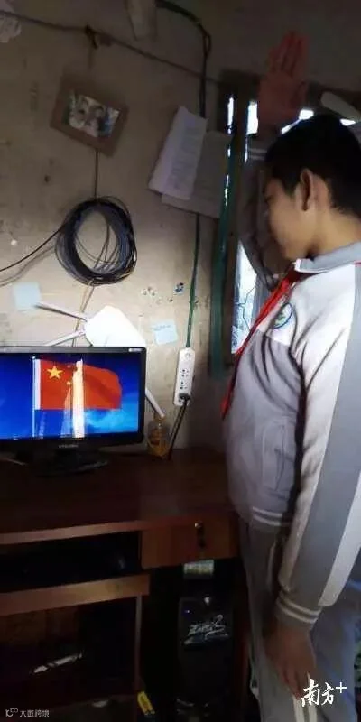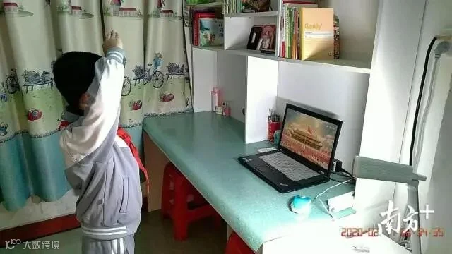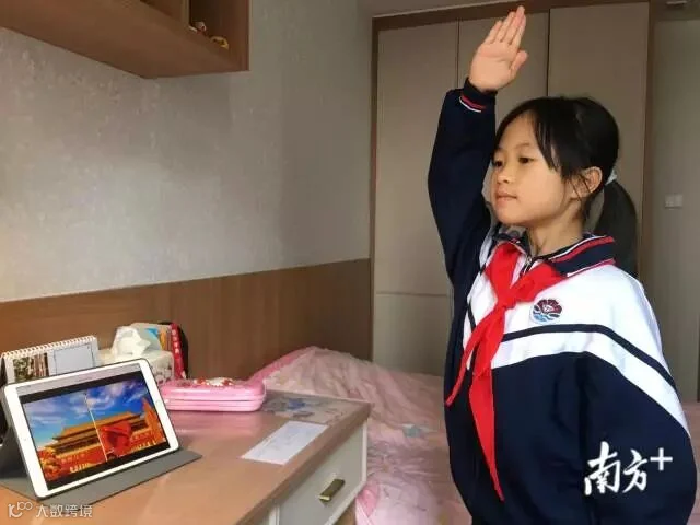 广州市越秀区五羊小学学生在家参加线上升旗仪式。
