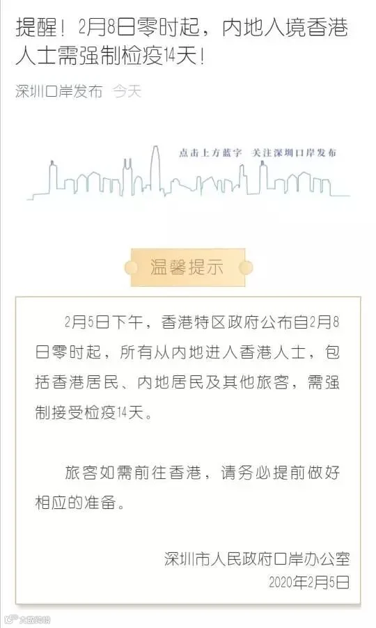 另外,据深圳市人民政府口岸办公室消息,香港特区政府公布,自2月8日零时起,所有从内地进入香港人士,包括香港居民、内地居民及其他旅客,需强制接受检疫14天。