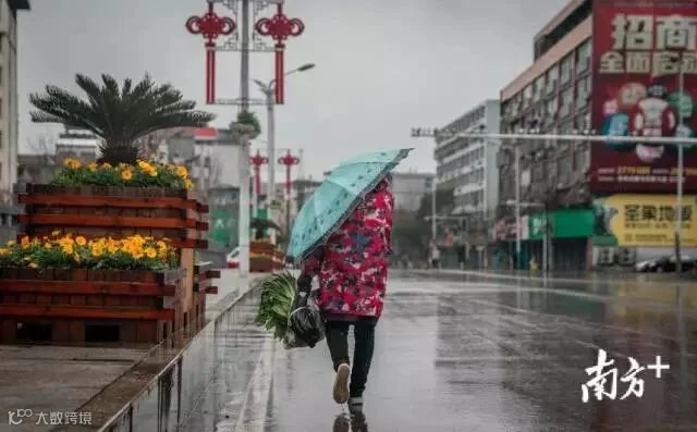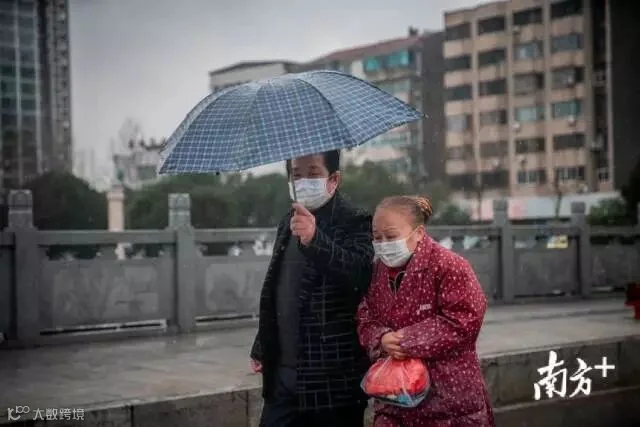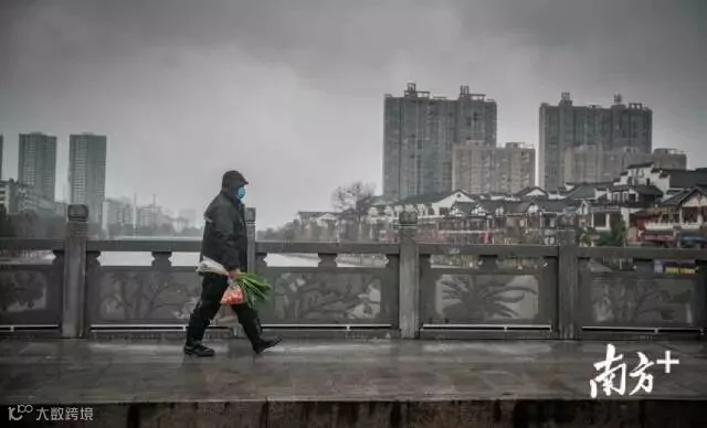 洪湖市新提一桥,刚采购完的市民正在冒雨前行,江边往日繁华的洪湖龙街一片安静。