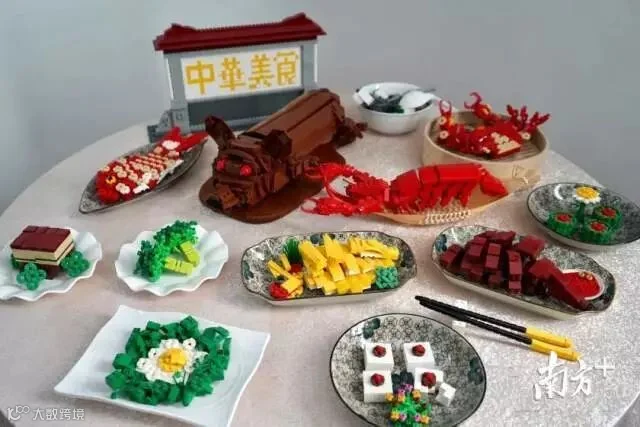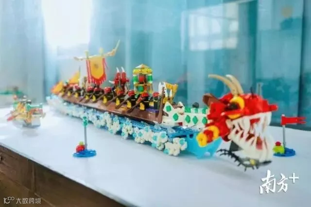 圆形餐桌上面摆放着粤菜“九大簋”,包括烧乳猪、白切鸡、广式点心、龙虾等。旁边的玻璃柜中还摆放张飞狮、广州骑楼、龙船等岭南特色文化作品。据了解,黎志宁做出龙船模型的时间,比乐高官方推出龙舟限定款还要早两年。