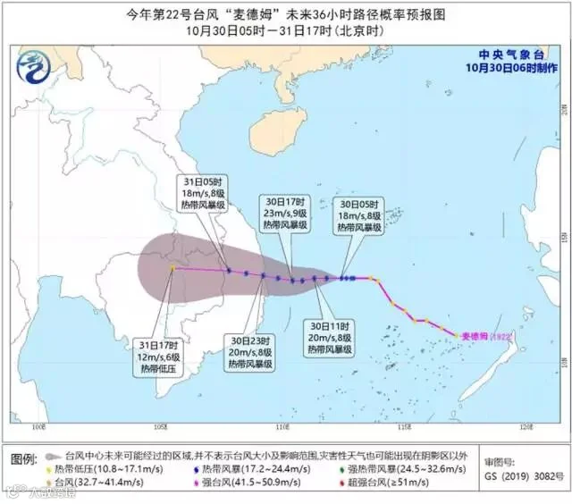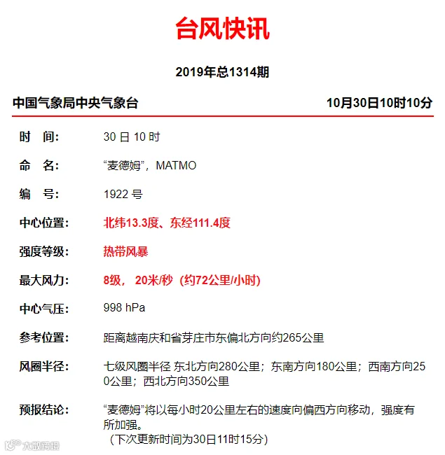 南海热带低压于30日凌晨2点钟加强为今年第22号台风“麦德姆”(热带风暴级;英文名称:Matmo;名字来源:美国;名称意义:大雨),早晨5点钟其中心位于越南庆和省芽庄市东偏北方约370公里的南海南部海面上,就是北纬13.4度、东经112.4度,中心附近最大风力有8级(18米/秒),中心最低气压为1000百帕,七级风圈半径180-350公里。