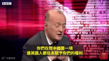 不料,杨岳桥遭到BBC主持人肖恩•莱伊(Shaun Ley)的质疑:“英国人从未赋予你们这一权利,你们问中国要一项连英国人都从未赋予你们的权利?”