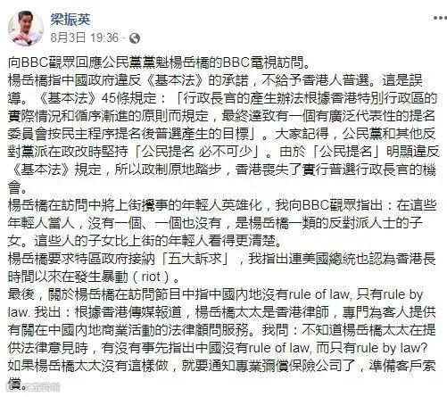 杨岳桥善辩更善变。2019年8月2日晚间,英国广播公司(BBC)网站发布了一段对杨岳桥的专访视频。他在接受采访中高谈阔论:香港民众需要“普选权”。