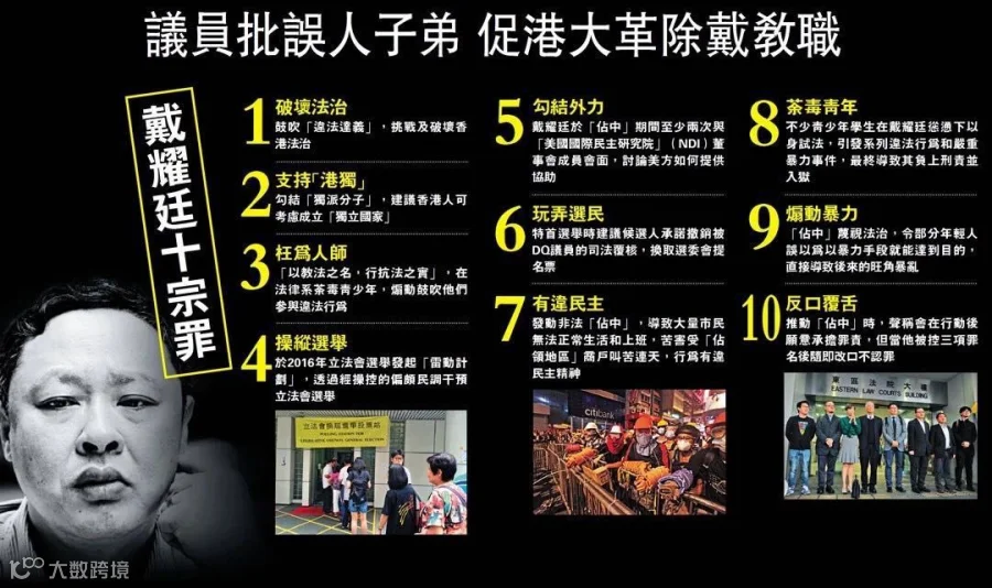 陈浩天原本并不热忱于政治,他还有一名“引路人”——香港大学法律系副教授戴耀廷。今天,港嘢君要讲的正是这名藏匿于象牙塔里的“戴妖”,他不满足于“学术精英”,还要做“政治精英”“国王”;他荼毒青少年,却将自家二子一女“宠得天上有地下无”;他被批评为“空想家”,实际却密训乱港“风云兵”。