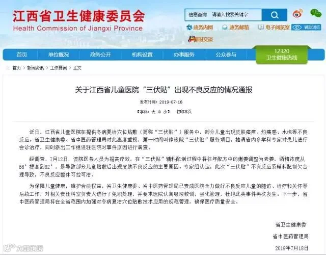 18日晚,江西省卫健委发布关于江西省儿童医院三伏贴出现不良反应的情况通报。经过调查,部分儿童贴敷后出现皮肤不良反应的主要原因是该院医务人员为提高疗效,在三伏贴辅料配制过程中将往年配方中的嫩姜调整为老姜,酒精浓度从56°提高到62°。专家组认定:此次三伏贴不良反应系辅料配制欠合理导致,不良反应整体可控可治疗。