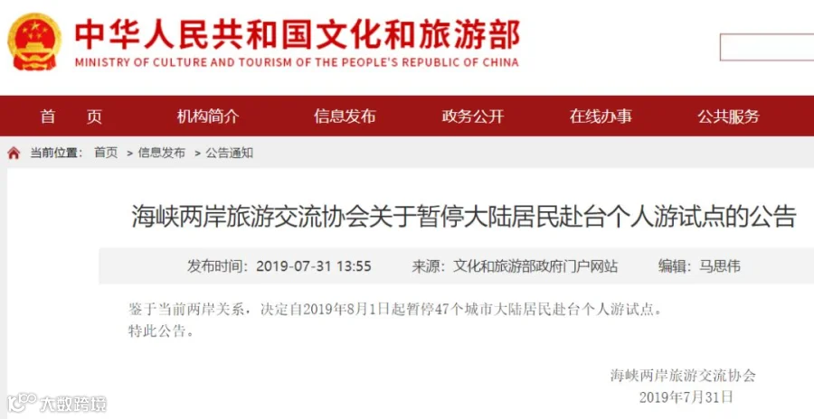 据文化和旅游部政府门户网站消息,鉴于当前两岸关系,决定自2019年8月1日起暂停47个城市大陆居民赴台个人游试点。