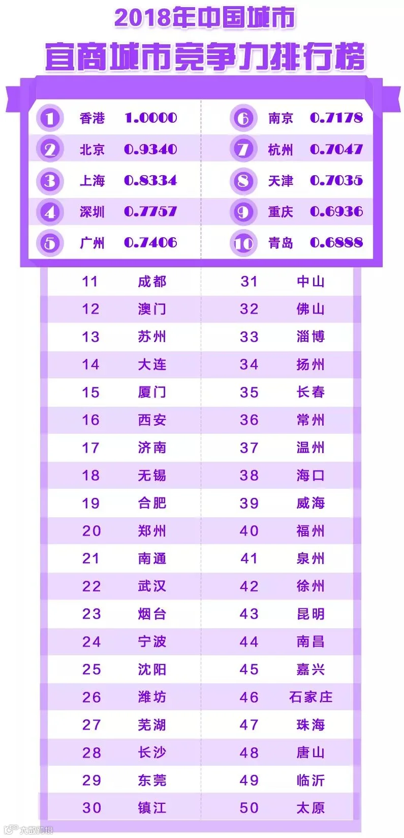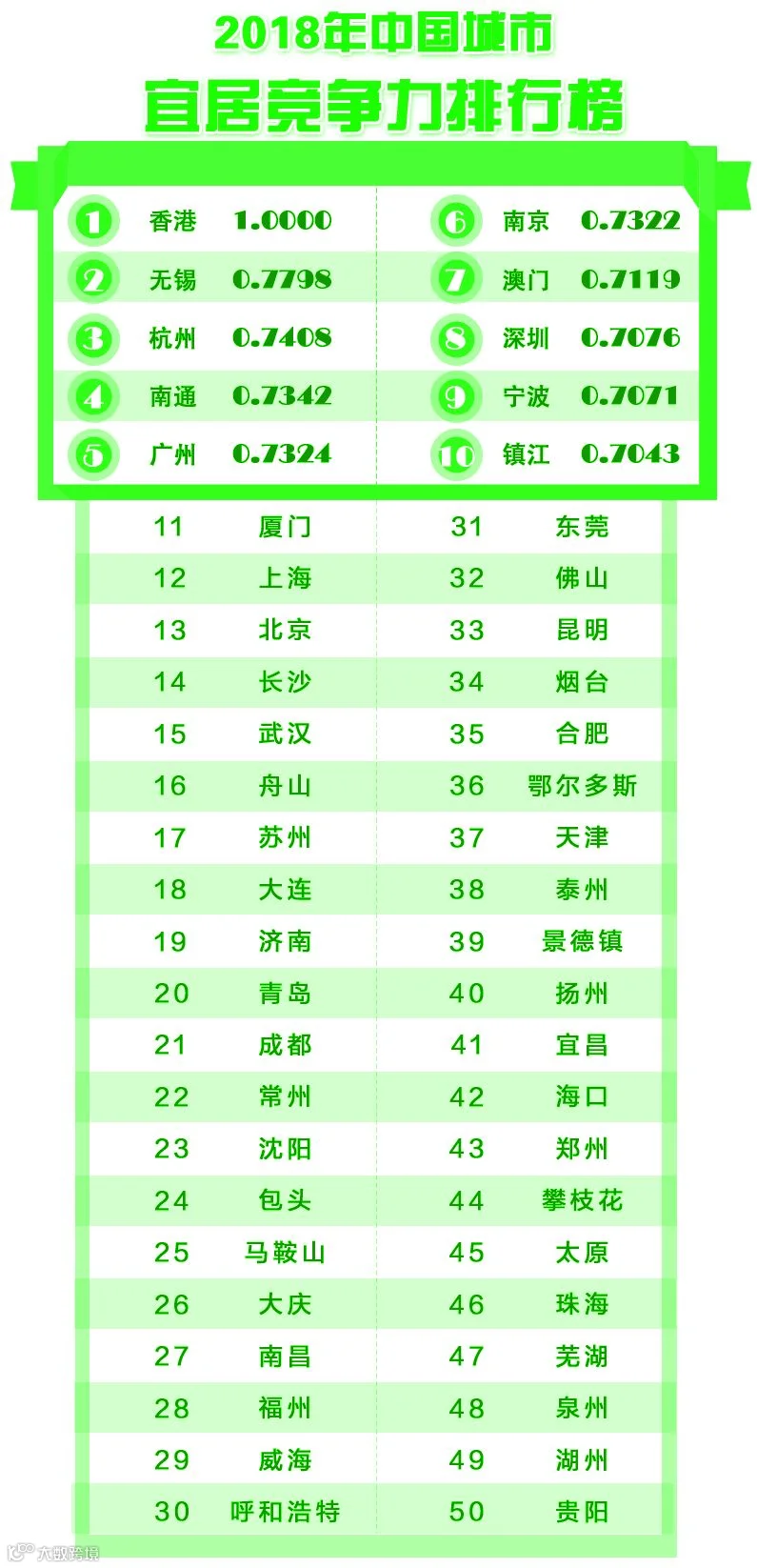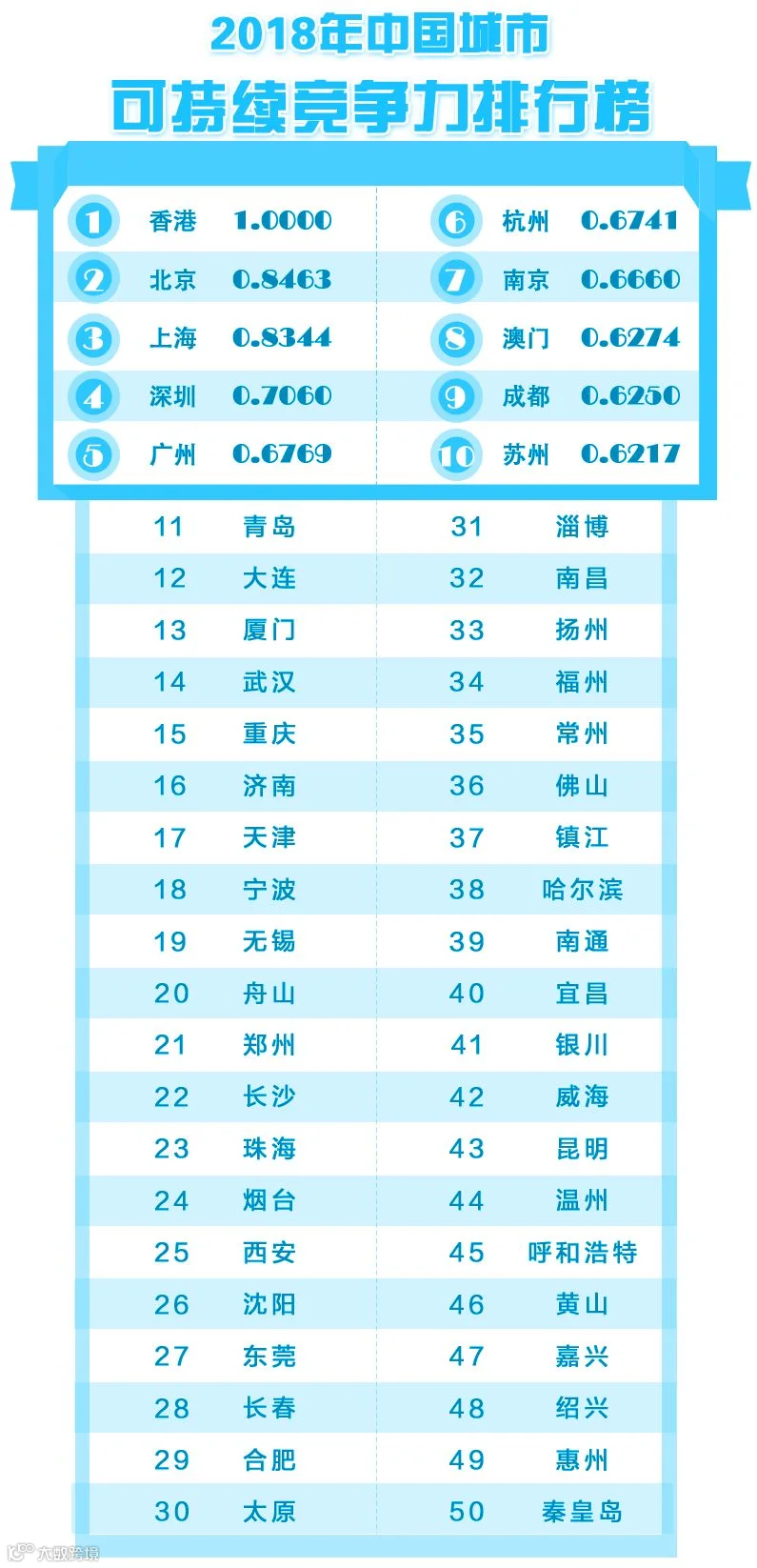 有6个城市进入前50名