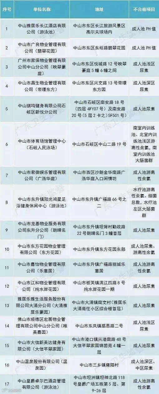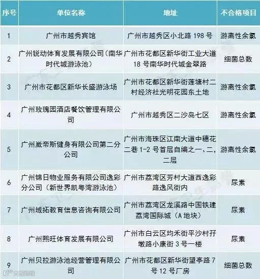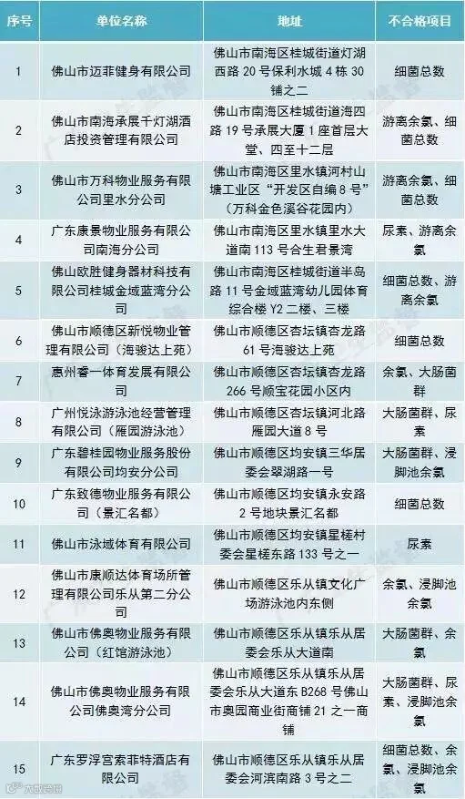 为保障广东省游泳场所水质卫生安全,6月起,广东省各级卫生监督机构联合疾病预防控制部门,分批次对各地游泳场所水质进行了监督抽检。检测指标为游离性余氯、浑浊度、尿素、pH值、细菌总数、大肠菌群等六项。