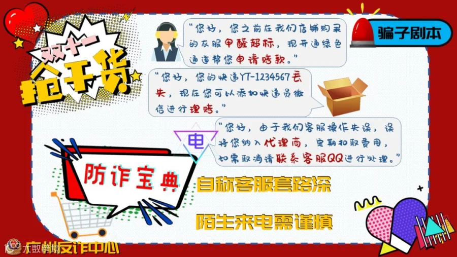 2.凡是自称“网店、电商平台、快递”等客服,来电要求配合“退款、理赔、解除身份绑定”等操作,要求加QQ、微信指引操作的,都是诈骗!