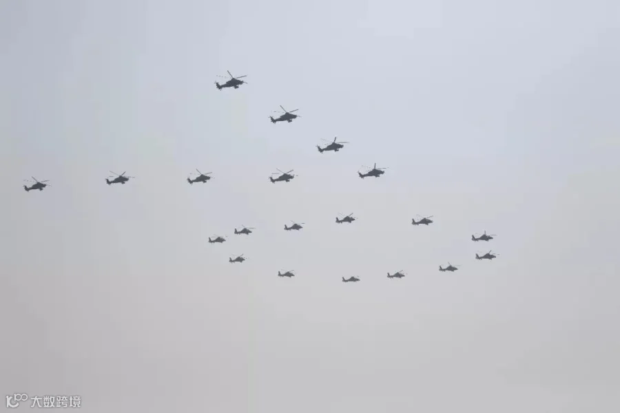 这是20架直升机在空中组成“70”字样。新华社记者 王凯 摄