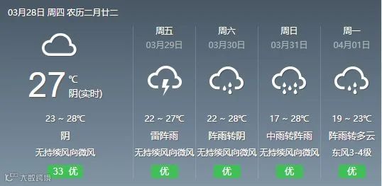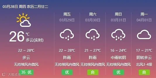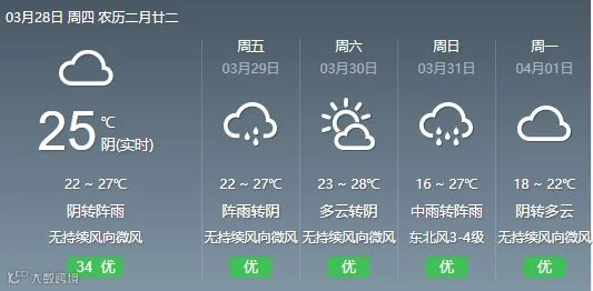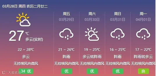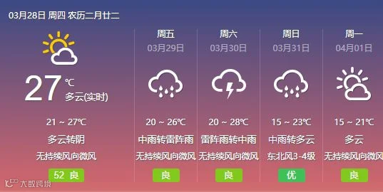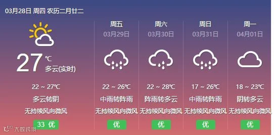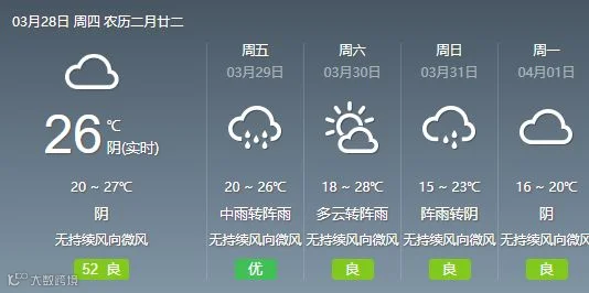 28日,韶关、清远阴天间多云转中(雷)阵雨局部大雨,其余市县阴天到多云,有分散零星小雨。大部分市县早晚有轻雾或雾。