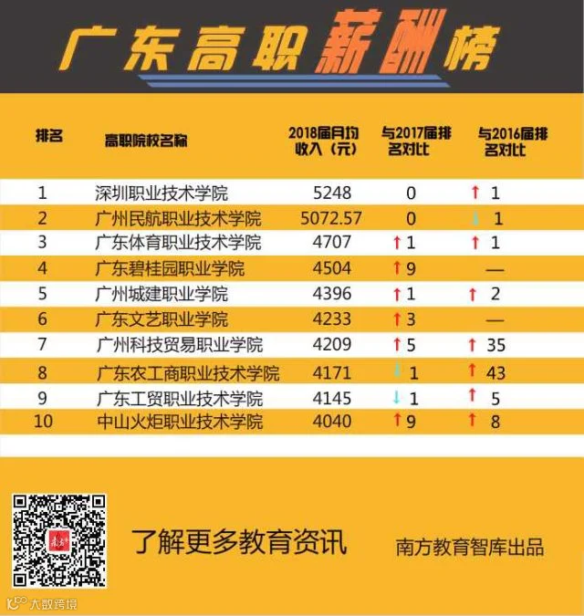 其中,深圳职业技术学院5248元、广州民航职业技术学院5072.57元排前2位,均突破5000元。深圳职业技术学院连续三年毕业生平均月薪最高,93%毕业生留在深圳工作,这与企业密切联动分不开。华为从2016年开始接收该校应届毕业生达112人,岗位包括技术员、人力资源事务员。