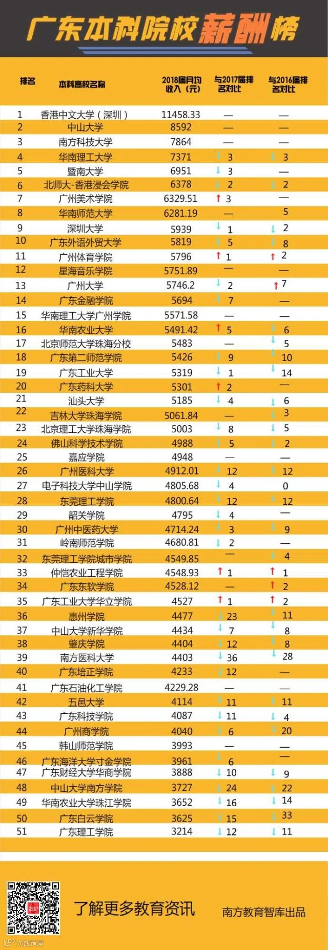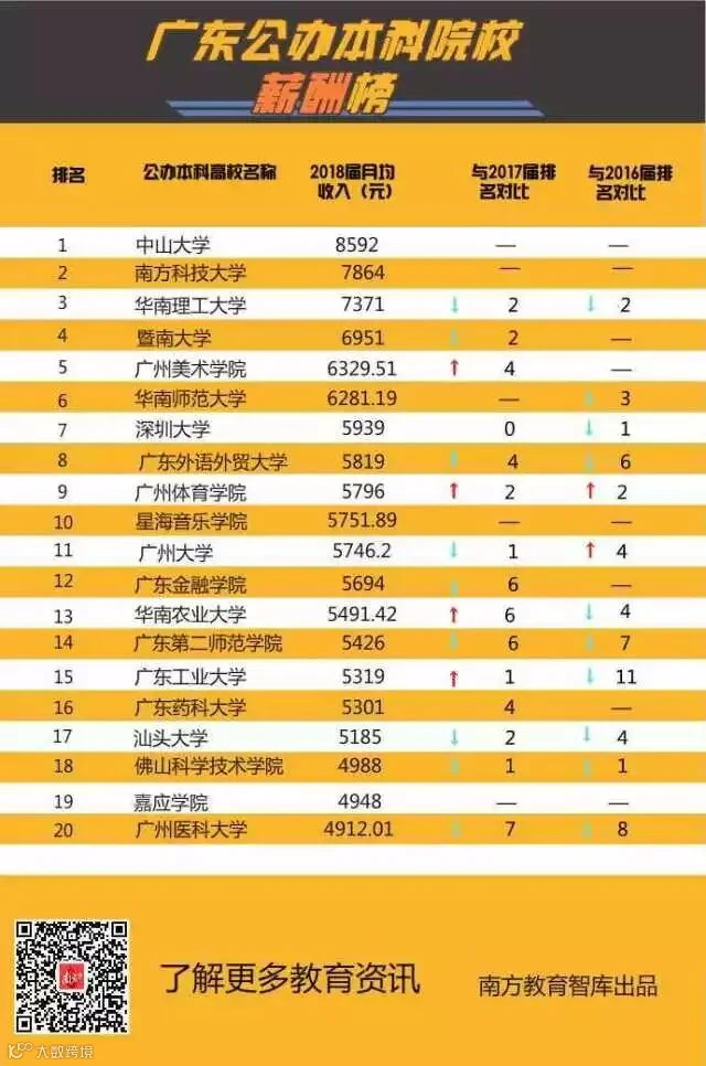 不久前,省教育厅发布了《2018年高校毕业生就业质量年度报告》,全省本科毕业生平均月薪为4522元。已公布相关数据的51所本科高校中,有35所超过了全省本科毕业生的平均月薪,其中中山大学8592元、南方科技大学7864元、华南理工大学7371元名列前3位,均超过7000元。